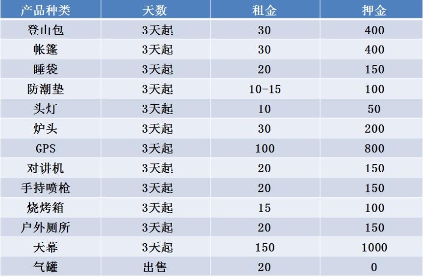 二、租金和押金:租用裝備時(shí)需要交付押金。為方便在校學(xué)生,可以用有效學(xué)生證+50%的押金或有效證件+50%的押金。租金和押金詳情請(qǐng)參考下文。
